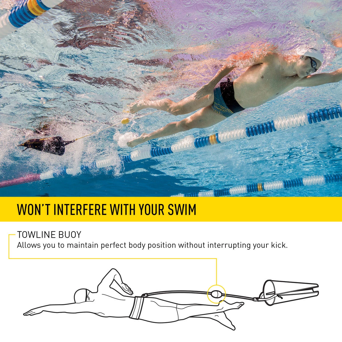 - Towline buoy maintains proper body alignment without interrupting a natural kick cycle