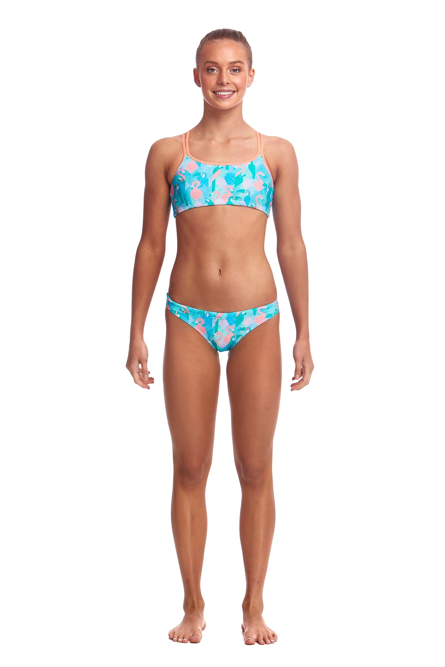 A double strap crossover back that provides added comfort and support for hours in the pool. Pairs back with the new skinny brief which provides firm rear coverage with drawcord.